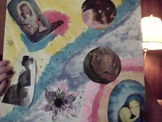 Mine had a giant black and purple flower, a picture of bride, a madonna and child, a girl taking off her mask, a girl blowing on a wishing flower and a happy baby picture of me. All the colors I painted in between were really dissonant and didn't fit together the way I wanted them too, however the general consensus was that I have all these aspects of myself and individually they do well, but they aren't meshing as well as I want them too. In talking to my mom, she encouraged me that it was totally normal, and that it takes many years to get it down. And even in the long years ahead, there's no guarantee that you get it down perfect. I find that hopeful.
